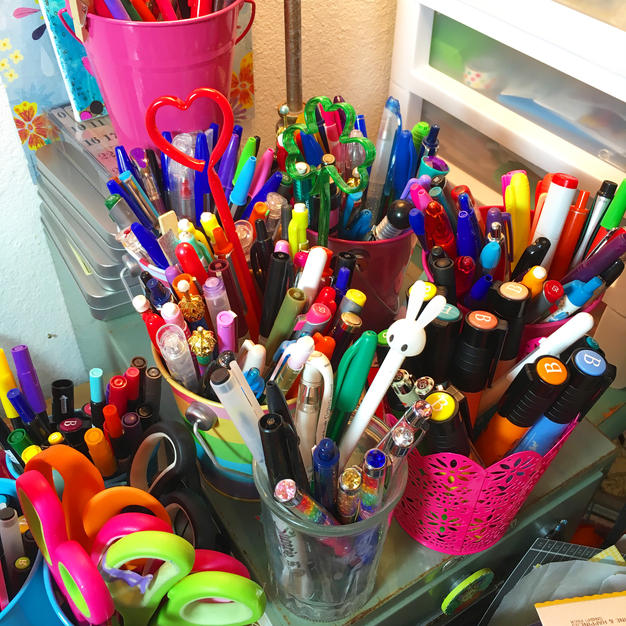 Yesterday was Pen and Pencil Day and I have a confession, I am a pen addict! I love pens , all kinds fine tip, ball point, colorful pens, brush tip pens… the list is endless. Here is a photo of the corner of my work table in my art room.