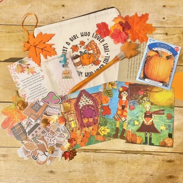 Kit includes all things fall: Rebecca Hoot Post Cards (3), Variety of fall theme ephemera,  ball point pen, paperclip apple and mixer charm, Twinkle Maple Leaf Pen; zipper pouch that says “A Girl who Loves Fall” and a Foxy Friend acrylic charm with Lobster clasp. I  hope you love the this kit brings you inspiration and love for all things Autumn!!