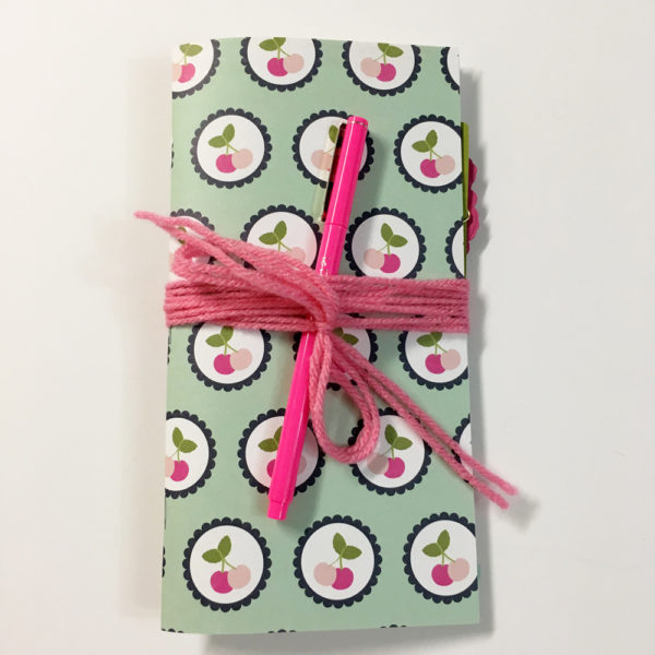 Standard Size (8.25 x4.5) Traveler’s Notebook. Covered with coverstock by Echo Park Paper Co. and and filled with blank 28 lb white paper along with coordinating ephemera and pretty papers.