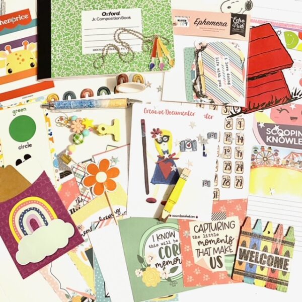 Kit includes: Rebecca Hoot Stickers, Variety of ephemera, composition book (half the Size), Echo Park ephemera pack,  rainbow ball point pen, beaded clip charm, Echo Park journal cards , washi. tape and art themed ball chain necklace.